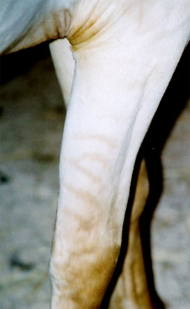 These leg stripes are those of Finally's Mr. Amos, a dun perlino Morgan stallion. Leg stripes are typical dun characteristics, along with dorsal stripes, face masks and frosting on manes and tails. Dun is thought to be an ancient pattern with some cave paintings apparently depicting dun horses.
