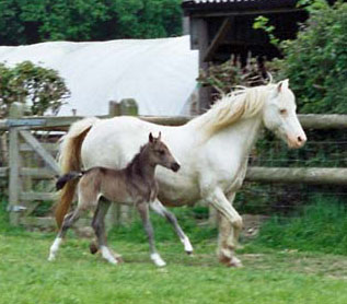 Sarah bought Welsh section C mare Forlan Welsh Cream assuming she was a cremello, but when the foals arrived she changed her mind! Welsh Cream had three dark buckskins foals and three foals who all looked like non dilute liver chestnut. All six foals were by the same chestnut stallion! Sarah realised that Welsh Cream is in fact a perlino and the “liver” foals are most probably dilute blacks (smokey black). Many thanks to Sarah for sharing this photo, and her story, with me!